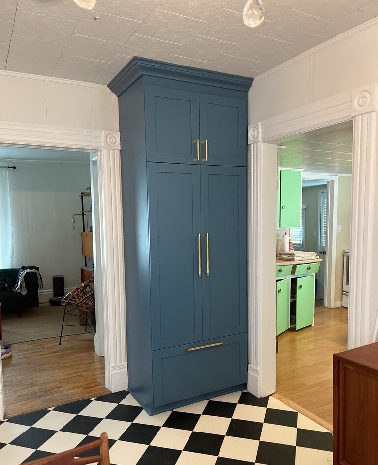 Solid maple pantry featuring five pull-out trays and one large bottom drawer. Designed for maximum storage and organization, with clean lines and refined hardware. Shown both before finishing and after final installation.